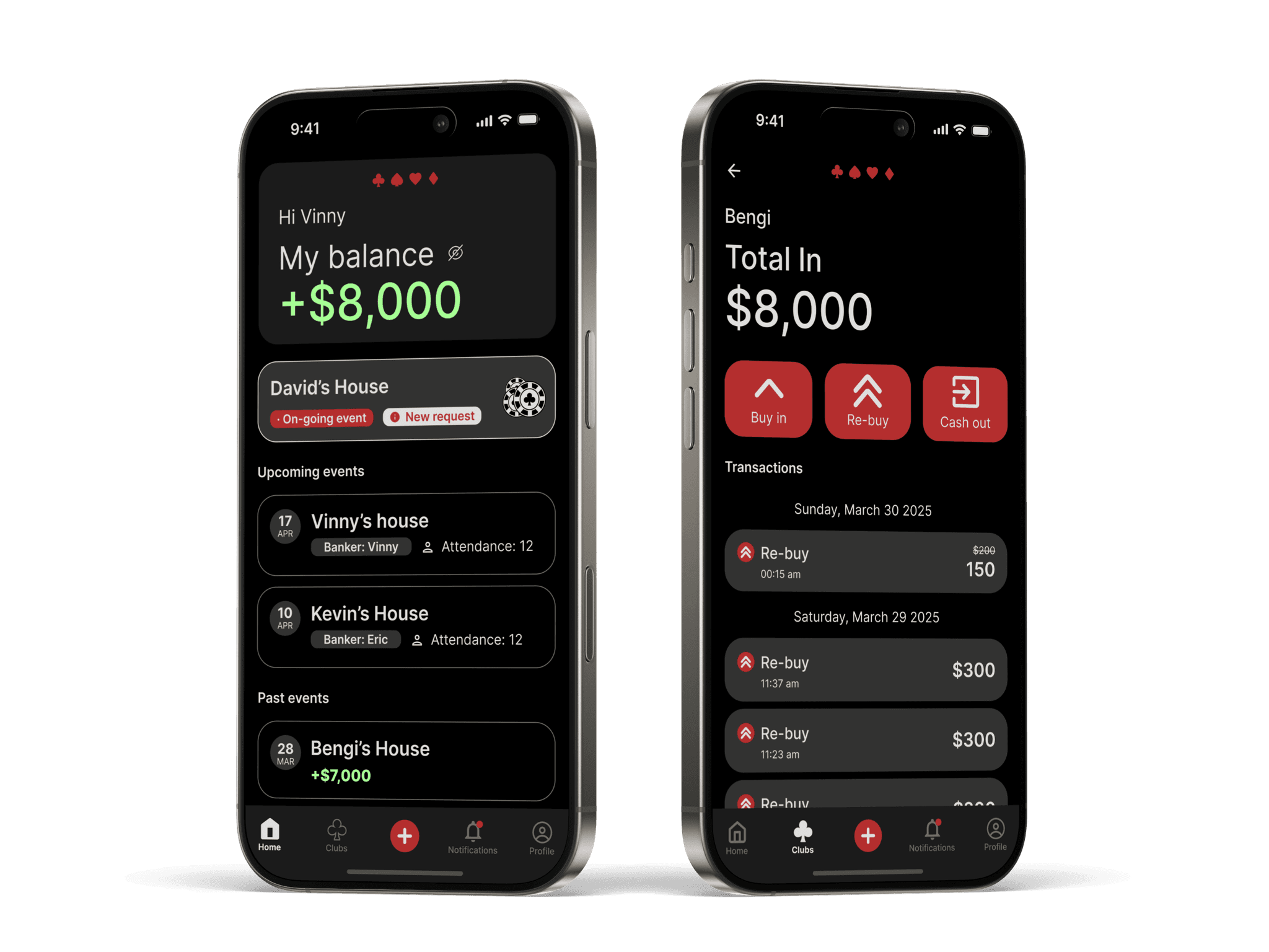 PokerHub is a mobile app that helps players, dealers, and hosts stay organized by letting them create poker clubs, set up events, and record every transaction during a game—so it’s always clear who owes what. It makes running and settling games easier, faster, and fair for everyone.